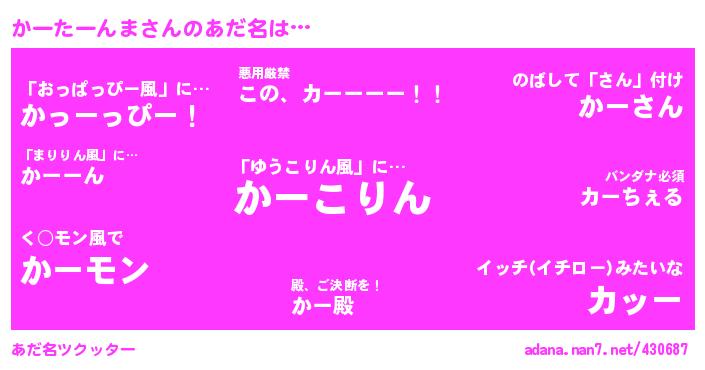 | 男性向けラノベタイトル風あだ名 | 『かーたーんま~年齢イコール彼女いない歴の魔法使い~』 |