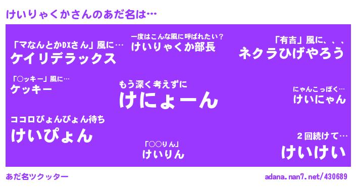 | 男性向けラノベタイトル風あだ名 | 『ノーゲーム・ノーケイリャクカ』『ケイリャクカアートオンライン』 |