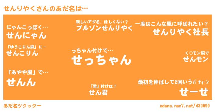 | ヒーロー風カッコイイあだ名 | 『究極戦士センリヤク』『魔戒騎士セン』『天空の使者せんりやく』 |