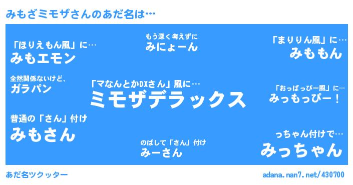 | ポケモン風あだ名 | 『ミーモイ』『ミモチュウ』『ミモキング』『ミモザダネ』 |