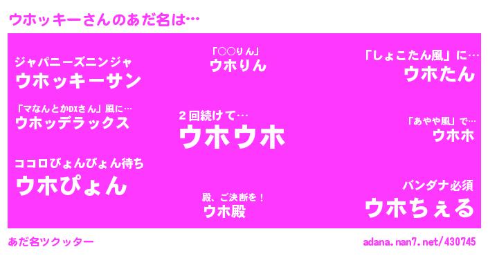 | 男性向けラノベタイトル風あだ名 | 『この素晴らしい世界にウホッキーを!』『はたらくウホッキーさま!』 |