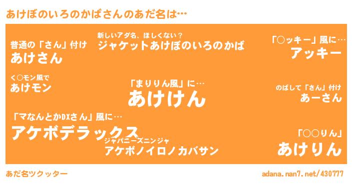 | ヒーロー風カッコイイあだ名 | 『炎刃騎士アケ』『友情の使者あけぼのいろのかば』『仮面アケダー』 |