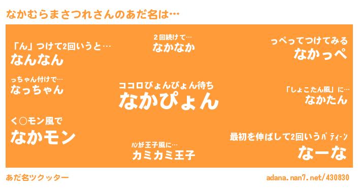 | ヒーロー風カッコイイあだ名 | 『天空の使者なかむらまさつれ』『スーパーナカムラマサツレ』 |