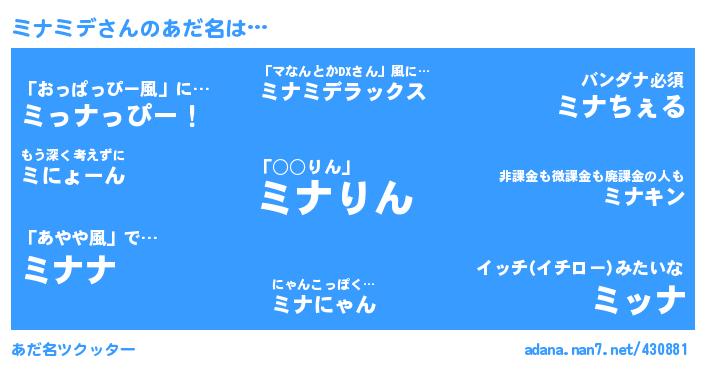 | ヘコむあだ名 | 『ミナふぇ~』『豆乳』『ミナぷりん』『ミナミデ(小並感)』 |