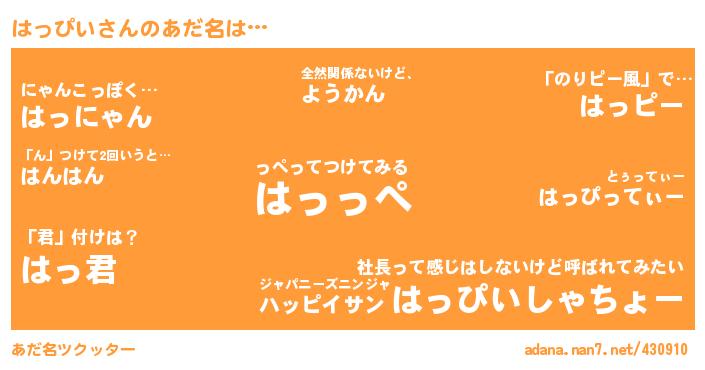 | 男性向けラノベタイトル風あだ名 | 『はっぴいの嫁は女の子じゃないと思った?』『転生したらはっぴいだった件』 |