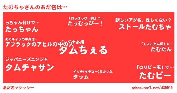| ポケモン風あだ名 | 『メロタッム』『ヒタムチャ』『タムゴンZ』『ゼニタム』 |