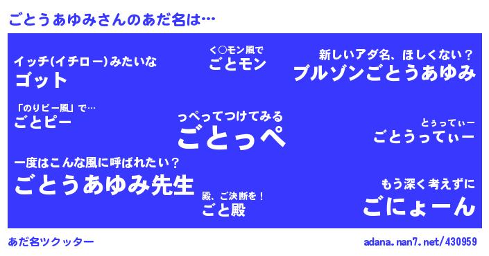 | ヒーロー風カッコイイあだ名 | 『ウルトラごとうあゆみマン』『友情の使者ごとうあゆみ』『仮面ゴトダー』 |