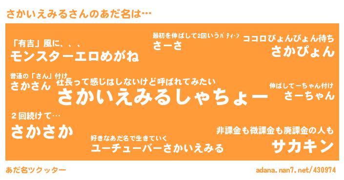 | ポケモン風あだ名 | 『サーカイ』『ヒサカイエミル』『サカセウス』『サカゴンZ』 |