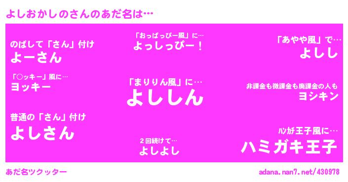 | ピコ太郎風あだ名 | 『ヨシ二郎』『ヨコ六郎』『ピコヨ郎』『ピヨ太郎』『ヨヨ太郎』 |