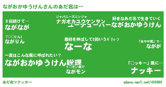 | 意味不明あだ名 | 『住所不定無職ながおかゆうけん(40歳)』『ペロリンながおかゆうけん』 |