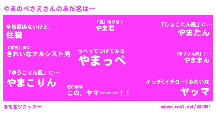 | ヘコむあだ名 | 『やまふぇ~』『豆乳』『やまぷりん』『やまのべさえ(小並感)』 |