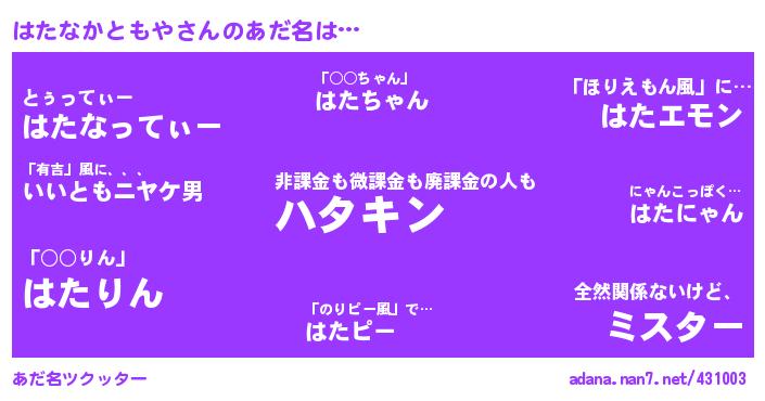 | ポケモン風あだ名 | 『ハタナダネ』『ハタゴンZ』『ハータイ』『ハタキング』 |