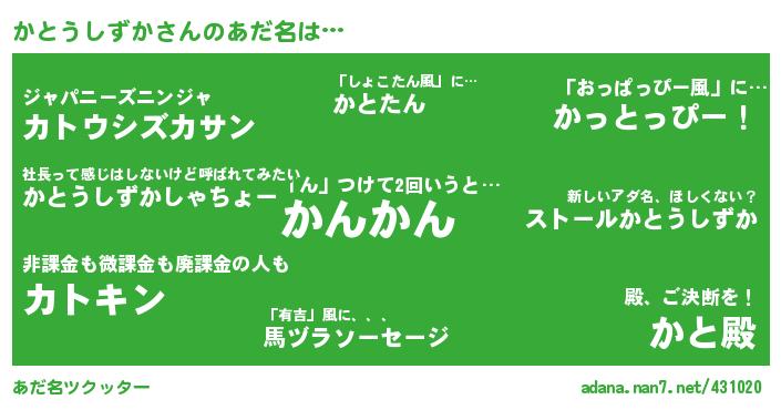 | 料理風あだ名 | 『ネギたっぷりかとうしずかの南蛮漬け』『☆柿とかとうしずかの簡単サラダ☆』 |