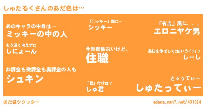 | 意味不明あだ名 | 『眠気覚ましガムしゅたるく味』『ペロリンしゅたるく』『自称しゅたるく』 |