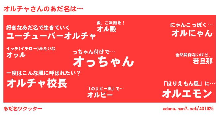 | 男性向けラノベタイトル風あだ名 | 『Re:オルチャから始める異世界生活』『はたらくオルチャさま!』 |