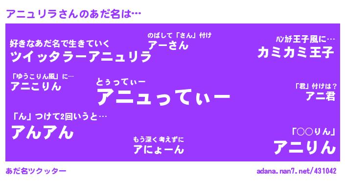 | 男性向けラノベタイトル風あだ名 | 『Re:アニュリラから始める異世界生活』『はたらくアニュリラさま!』 |