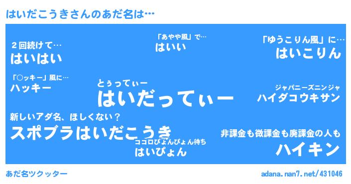 | ヘコむあだ名 | 『はいふぇ~』『豆乳』『はいぷりん』『はいだこうき(小並感)』 |