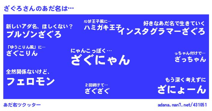 | ヘコむあだ名 | 『ざぐふぇ~』『豆乳』『ざぐぷりん』『ざぐろ(小並感)』 |