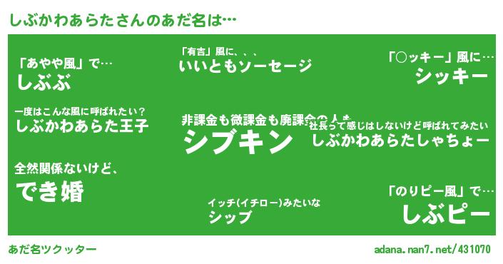 | 男性向けラノベタイトル風あだ名 | 『しぶかわあらた~年齢イコール彼女いない歴の魔法使い~』 |