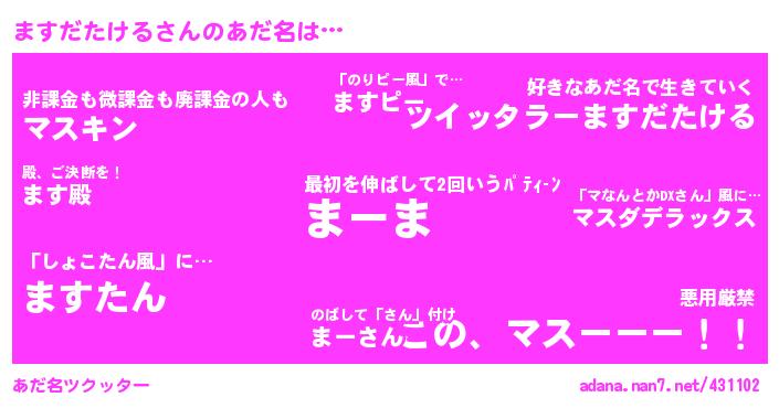 | 女子向けラノベタイトル風あだ名 | 『死神ますだたけるの再婚』『ますだたけるアンティーク』 |