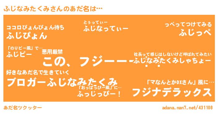 | 意味不明あだ名 | 『ペロリンふじなみたくみ』『住所不定無職ふじなみたくみ(79歳)』 |