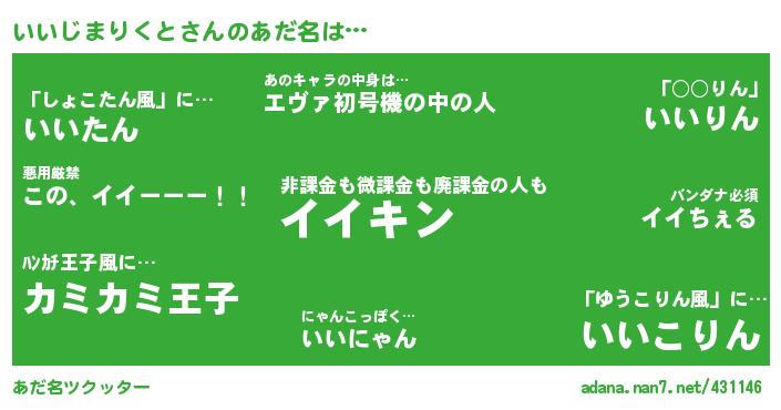 | 意味不明あだ名 | 『ニラ科いいじまりくと属』『住所不定無職いいじまりくと(79歳)』 |