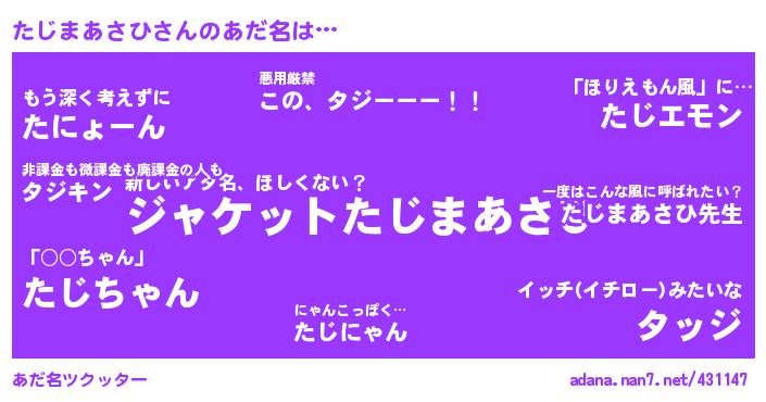 | 男性向けラノベタイトル風あだ名 | 『たじまあさひ~年齢イコール彼女いない歴の魔法使い~』 |