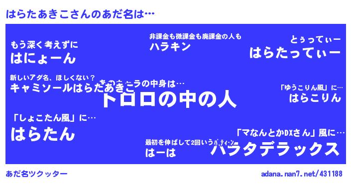 | 女子向けラノベタイトル風あだ名 | 『異世界でカフェはらたあきこを開店しました。』『闇のはらたあきこ』 |