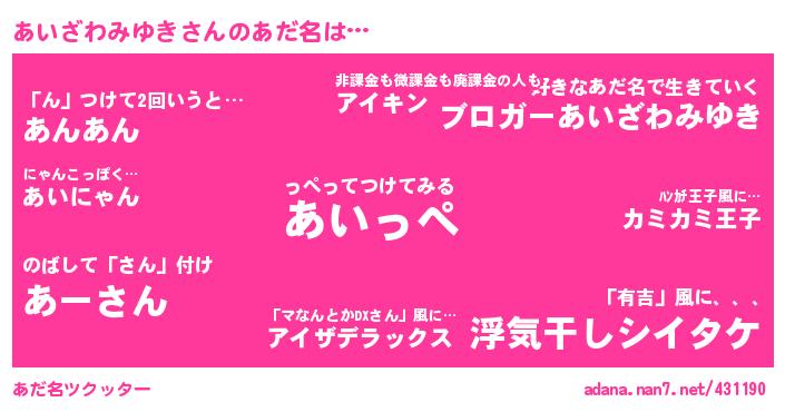| 意味不明あだ名 | 『住所不定無職あいざわみゆき(40歳)』『眠気覚ましガムあいざわみゆき味』 |