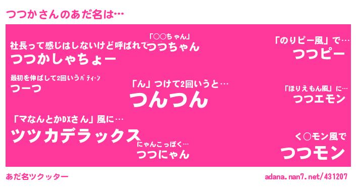 | 男性向けラノベタイトル風あだ名 | 『Re:つつかから始める異世界生活』『ノーゲーム・ノーツツカ』 |