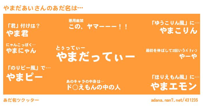 | 男性向けラノベタイトル風あだ名 | 『Re:やまだあいから始める異世界生活』『転生したらやまだあいだった件』 |