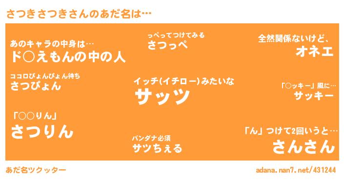 | 男性向けラノベタイトル風あだ名 | 『さつきさつきの嫁は女の子じゃないと思った?』『魔弾の王とさつきさつき』 |