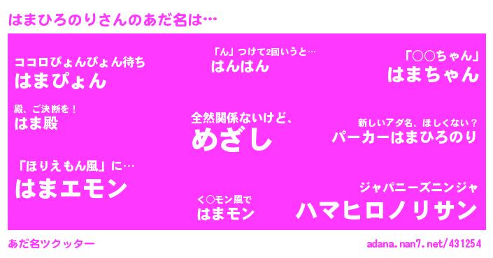 | ヘコむあだ名 | 『はまふぇ~』『豆乳』『はまぷりん』『はまひろのり(小並感)』 |