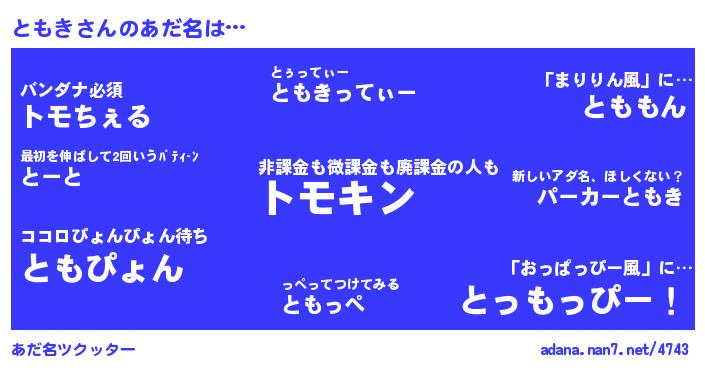 | 欧米人風あだ名 | 『アンジェラ・ともき』『ケンブリッジともき』『ダニエルともき』 |