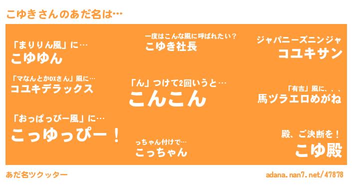 ポケモン風あだ名 | 『コックウザ』『コユゴンZ』『コユキダネ』『メロコッユ』 |