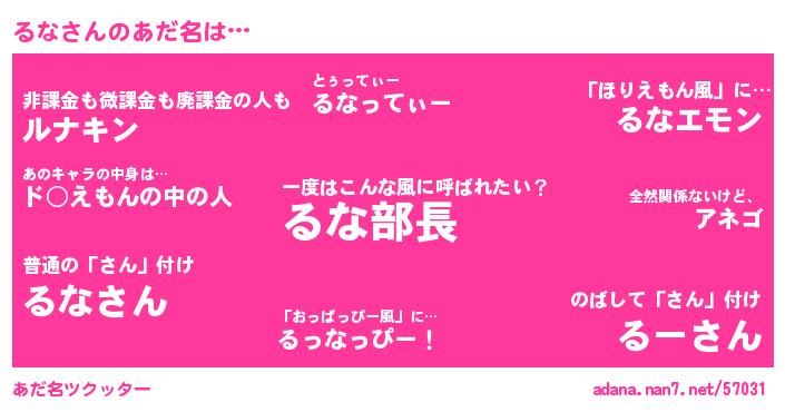 | 意味不明あだ名 | 『自称るな』『るなフォーエバー』『ペロリンるな』 |