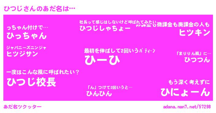 | ヘコむあだ名 | 『ひつふぇ~』『豆乳』『ひつぷりん』『ひつじ(小並感)』 |