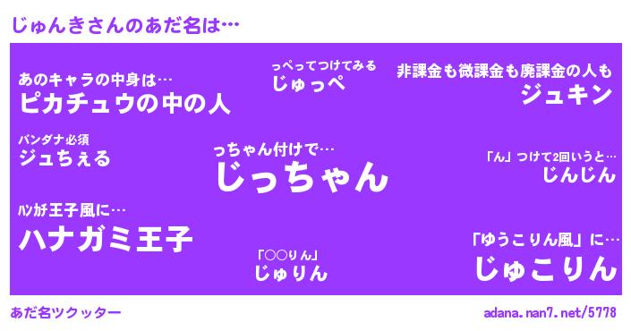 意味不明あだ名 | 『永久保存じゅんき』『自称じゅんき』『じゅんきフォーエバー』 |