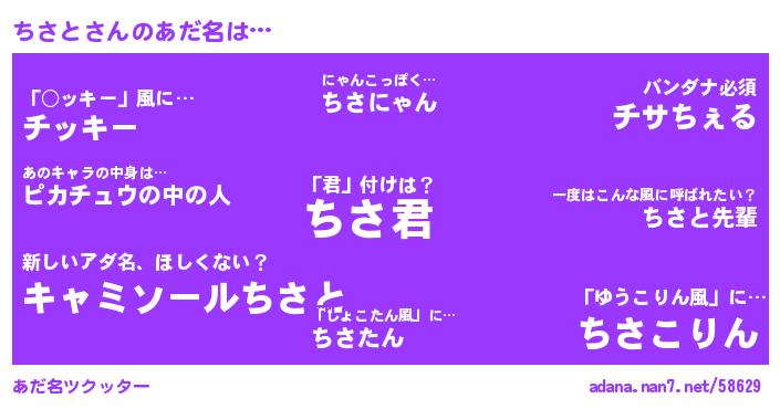 | ヘコむあだ名 | 『ちさふぇ~』『豆乳』『ちさぷりん』『ちさと(小並感)』 |