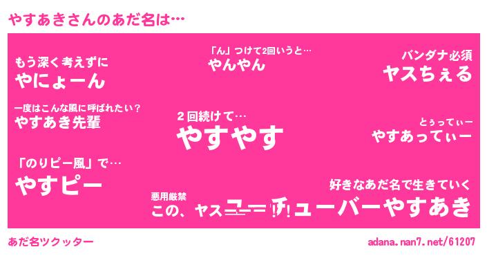 | ヒーロー風カッコイイあだ名 | 『スーパーヤスアキ』『ウルトラ戦士ヤスアキ』『ウルトラやすあきマン』 |