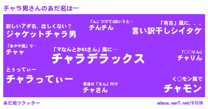 | 意味不明あだ名 | 『住所不定無職チャラ男(40歳)』『永久保存チャラ男』『ペロリンチャラ男』 |