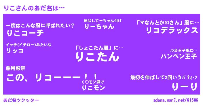 | 欧米人風あだ名 | 『ダルビッシュりこ』『ダニエルりこ』『アンジェラ・りこ』 |