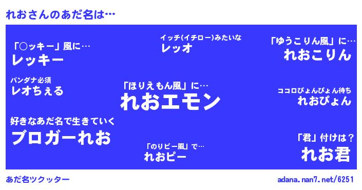 | 男性向けラノベタイトル風あだ名 | 『レオアートオンライン』『魔法科高校のれお』『転生したられおだった件』 |