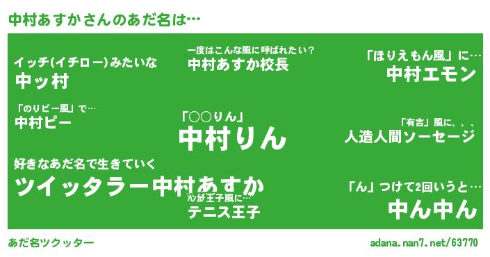 | 意味不明あだ名 | 『とにかく怪しい中村あすか』『自称中村あすか』『永久保存中村あすか』 |