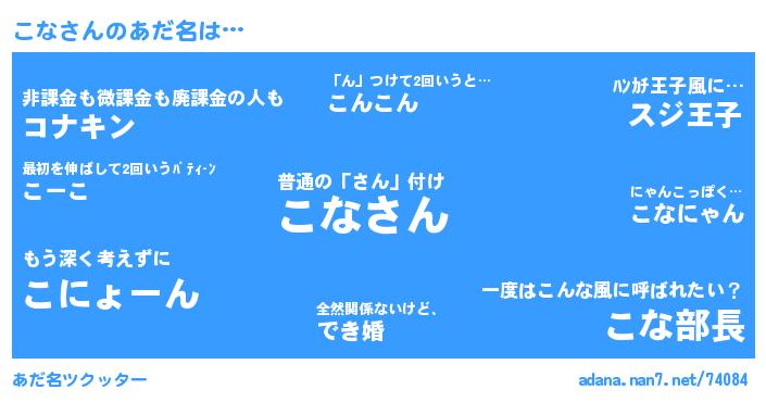 | 男性向けラノベタイトル風あだ名 | 『こなに滅ぼされるだけの簡単なお仕事です』『転生したらこなだった件』 |