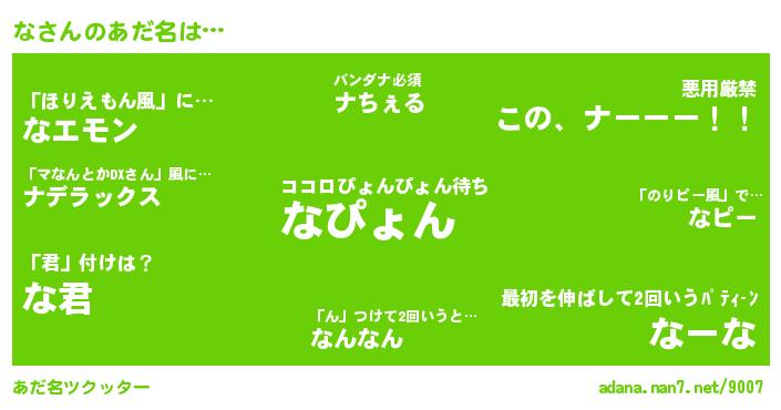 | ピコ太郎風あだ名 | 『ナ二郎』『ナナ太郎』『ナコ四郎』『ピナ太郎』『ピコナ郎』 |