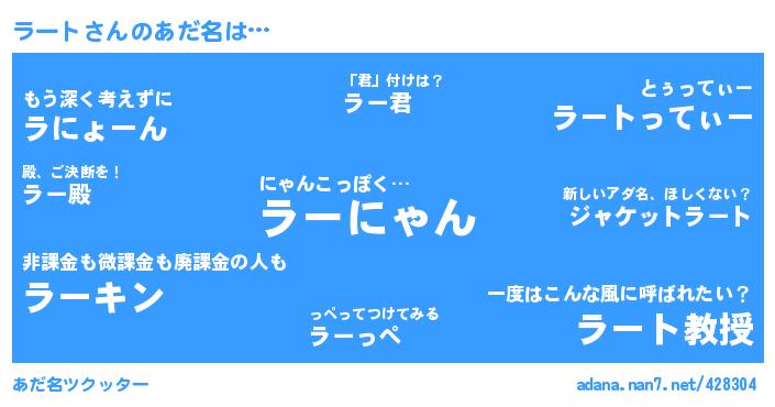 | 意味不明あだ名 | 『ラートフォーエバー』『永久保存ラート』『なめこ科ラート属』 |