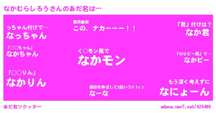 | ヒーロー風カッコイイあだ名 | 『ネオナカムラシロウ』『ウルトラなかむらしろうマン』『仮面ナカダー』 |