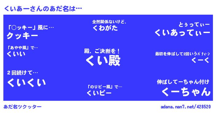 | 女子向けラノベタイトル風あだ名 | 『死神くいあーの再婚』『シンデレラくいあー家の靴箱館』『闇のくいあー』 |