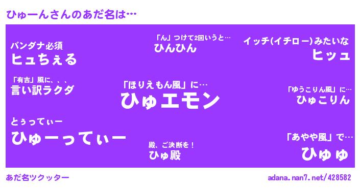 | ヘコむあだ名 | 『ひゅふぇ~』『豆乳』『ひゅぷりん』『ひゅうな(小並感)』 |